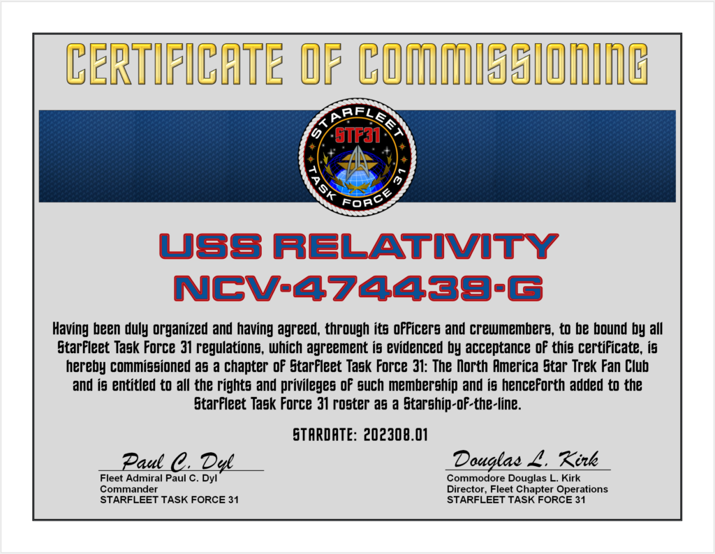 Today we commission into our ranks, the Starship USS Relativity, NCV-474439-G. She is an Wells Class Time Starship. This Chapter is based in East Hartford, CT, Earth, Sol Sector and CAPT Karl Woodard is the Commanding Officer.
