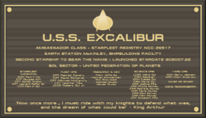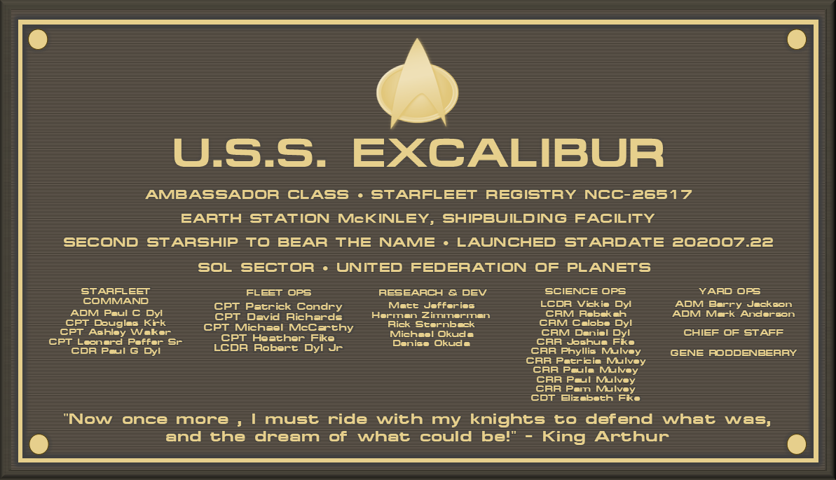 Welcome to the official website of the USS Excalibur NCC-26517. The USS Excalibur is a correspondence chapter of STARFLEET TASK FORCE 31, based out of Portsmouth, Rhode Island.